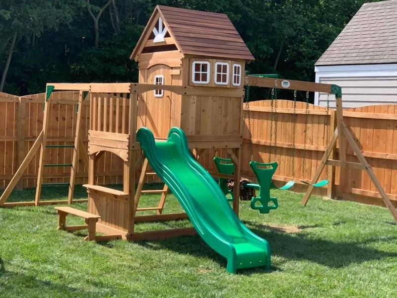 Backyard discovery montpelier all cedar playset 30211. The backyard discovery montpelier cedar wooden swing set will make your backyard the central location of the neighborhood with the abundant array of activities for your children and their friends. Out of stock online. Sandbox below playhouse and built in snack area with bench.