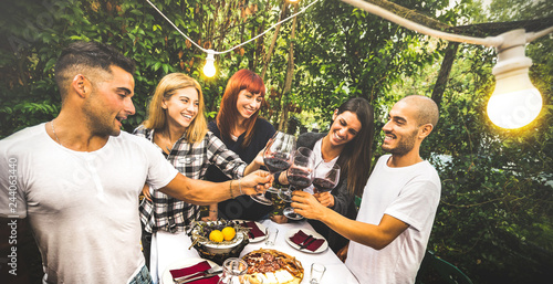 Happy Friends Having Fun Drinking Red Wine At Backyard Garden